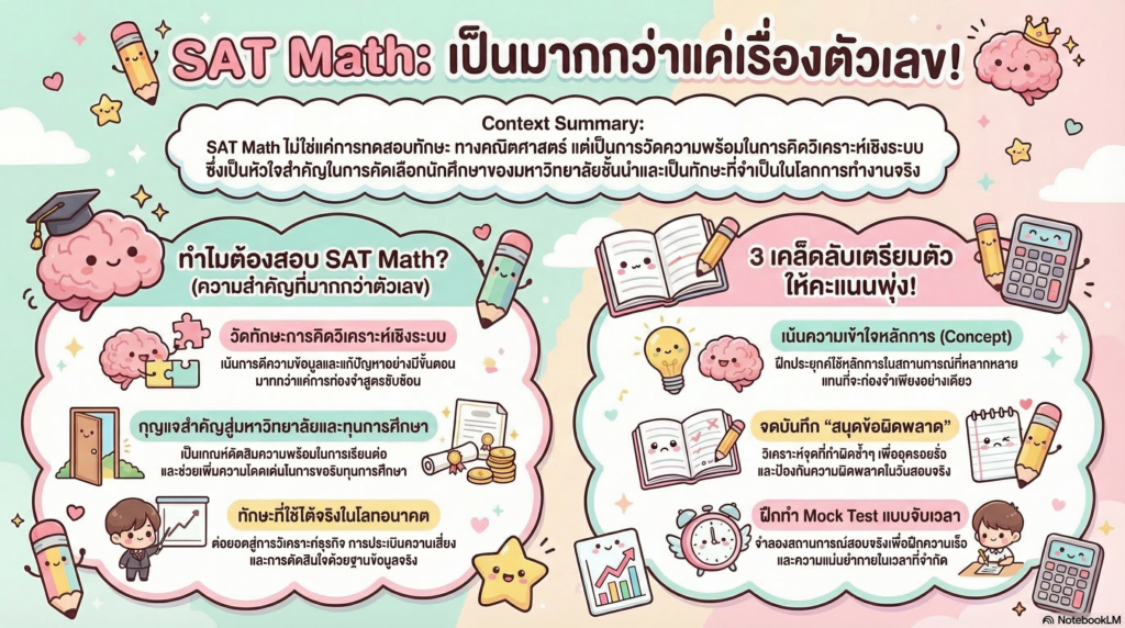 ตั้งใจจะสอบ SAT Math รู้หรือไม่ว่าในการสอบจริง เขาออกสอบบทอะไรบ้างเข้าใจครบในบทความเดียว อ่านจบแล้วรู้ทิศทางการเตรียมสอบทันที หลายคนที่กำลังจะสอบ SAT Math มักเริ่มต้นด้วยคำถามเดียวกัน เช่น ข่าวดีคือ SAT Math มีโครงสร้างชัดเจน และฝึกได้จริงความจริงแล้ว SAT Math ไม่ได้วัดว่าคุณเก่งคณิตขั้นสูงแค่ไหนแต่เป็นการวัดว่า “คุณเข้าใจพื้นฐานคณิต และใช้เหตุผลในการแก้ปัญหาได้ดีแค่ไหน” บทความนี้จะพานักเรียนและผู้ปกครองมาทำความเข้าใจว่า SAT Math มีบทอะไรบ้าง (อัปเดตล่าสุด)อธิบายทีละส่วนแบบเข้าใจง่ายอ่านจบจะเห็นภาพทันทีว่า👉 SAT Math ไม่น่ากลัวอย่างที่คิด👉 และสามารถวางแผนเรียนได้ถูกทางตั้งแต่ต้น SAT Math มีบทอะไรบ้าง (อัปเดตล่าสุด) เนื้อหา SAT Math แบ่งออกเป็น 4 กลุ่มหลักไม่ใช่คณิตแบบกระจัดกระจายเหมือนในโรงเรียนแต่เป็นบทที่ออกสอบซ้ำจริง และใช้ต่อยอดในการเรียนต่อ โครงสร้าง SAT Math ทั้ง 4 บท ได้แก่ เมื่อเข้าใจโครงสร้างนี้แล้วการเตรียมสอบ SAT Math จะง่ายขึ้นมาก Algebra ใน SAT…